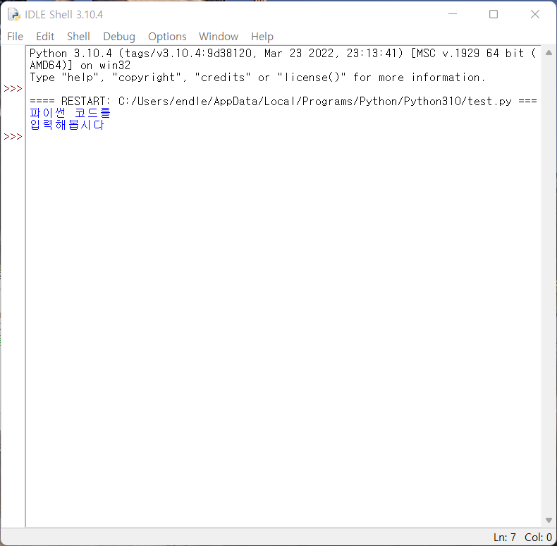 파이썬을 실행하셨습니다. 사용을 하고, 종료할 때에는 x버튼을 눌려서 종료하면 됩니다.